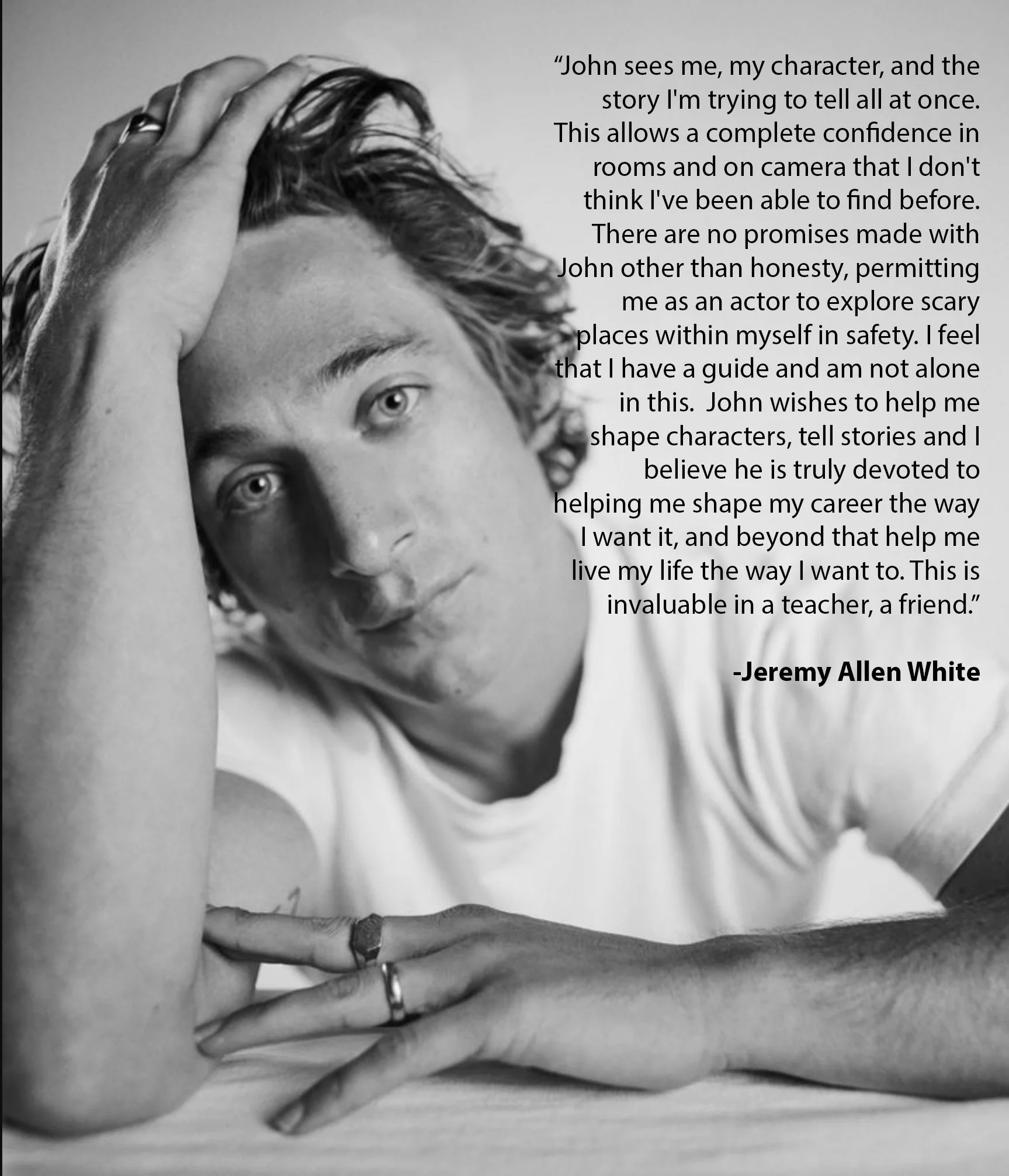 John approaches the work, and artists, with a sincere belief; there is no separation between life and art. Our personal evolution, as a human beings, is intrinsically connected to the development of our art. This symbiotic relationship allows experiences from life to enrich our art and discoveries through our art to further our self-awareness.